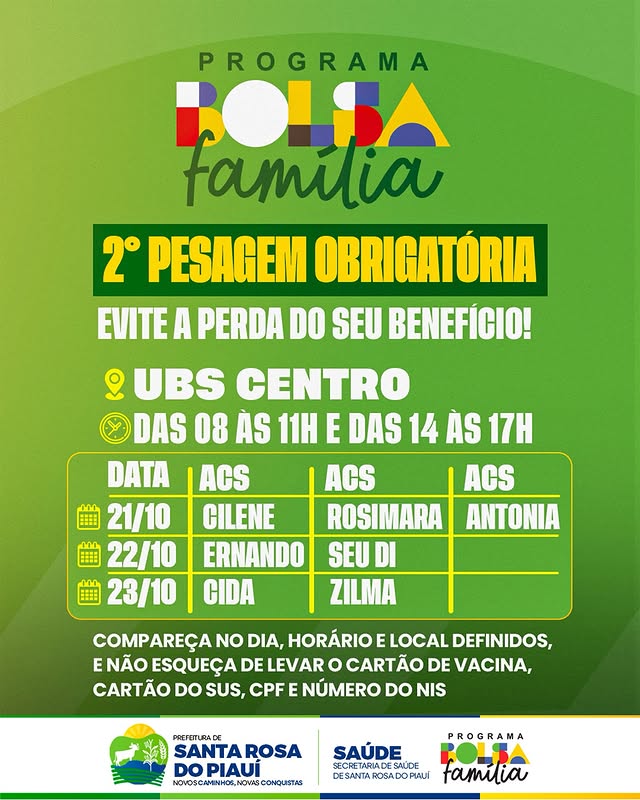 A Secretaria Municipal de Saúde informa que a 2ª pesagem obrigatória do Bolsa Família acontecerá nos dias 21, 22 e 23 de outubro, na UBS Centro, no horário das 8h às 11h e das 14h às 17h.