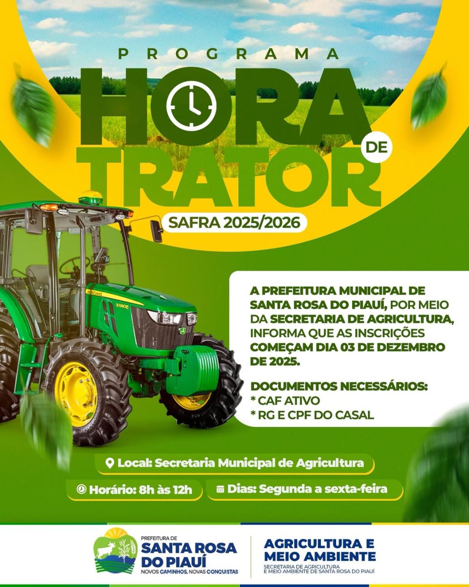 Estão abertas as inscrições para o Programa Hora de Trator, referente à safra 2025/2026. A ação tem como objetivo apoiar os produtores rurais na preparação do solo, contribuindo para o aumento da produtividade e o fortalecimento da agricultura local.