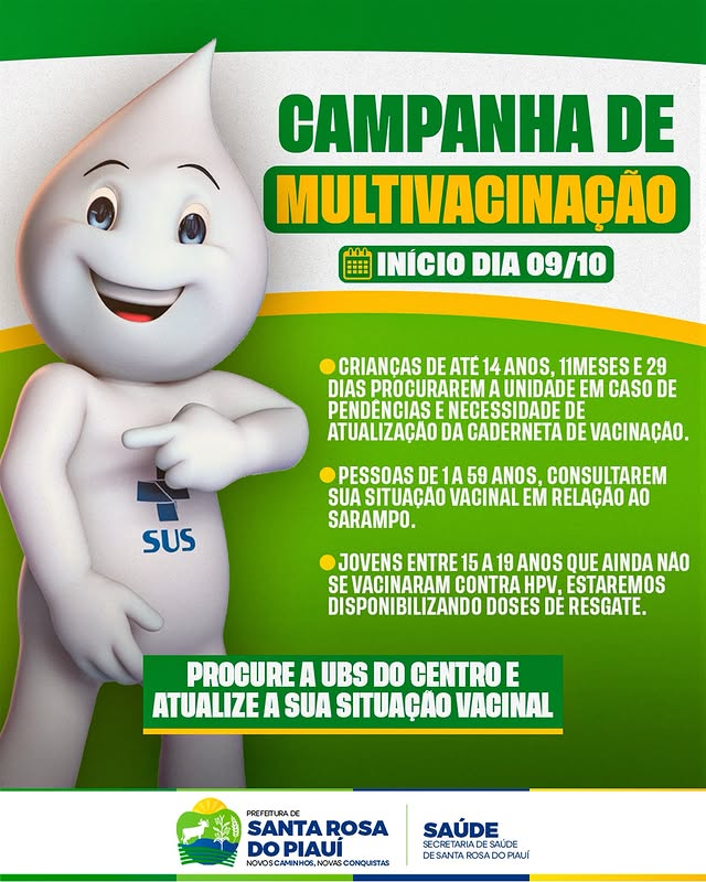 A Prefeitura de Santa Rosa do Piauí, por meio da Secretaria Municipal de Saúde, dará início à Campanha de Multivacinação no dia 09 de outubro, destinada a crianças, adolescentes e adultos que precisam atualizar a caderneta vacinal.