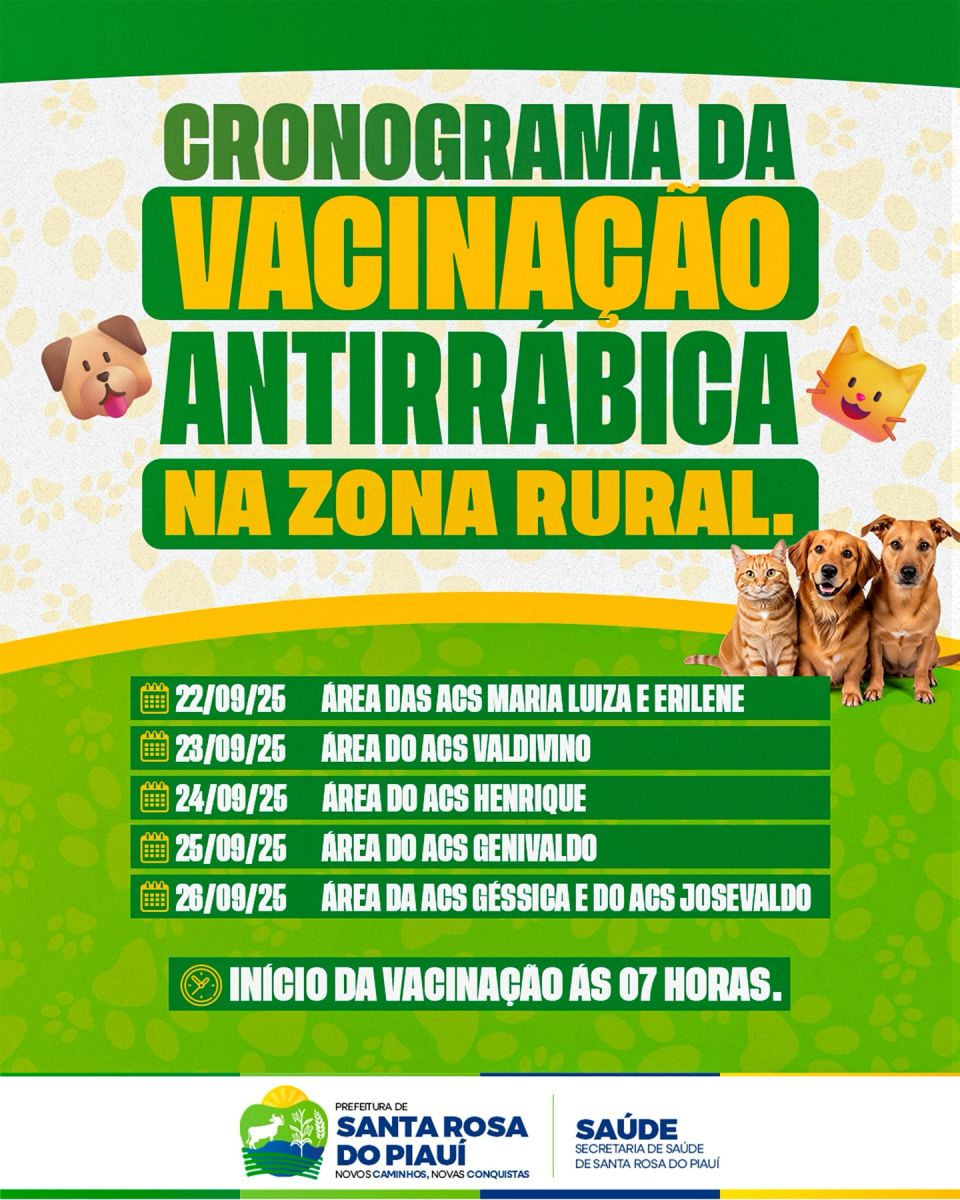 A Prefeitura de Santa Rosa do Piauí, por meio da Secretaria Municipal de Saúde, realizará entre os dias 22 e 26 de setembro a campanha de vacinação antirrábica na zona rural do município.