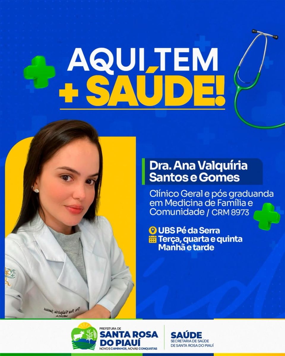 A Prefeitura de Santa Rosa do Piauí segue fortalecendo a Atenção Básica com a ampliação dos serviços de saúde no município. A médica Dra. Ana Valquíria Santos e Gomes está realizando atendimentos na UBS Pé da Serra, oferecendo cuidado, atenção e acompanhamento à comunidade.