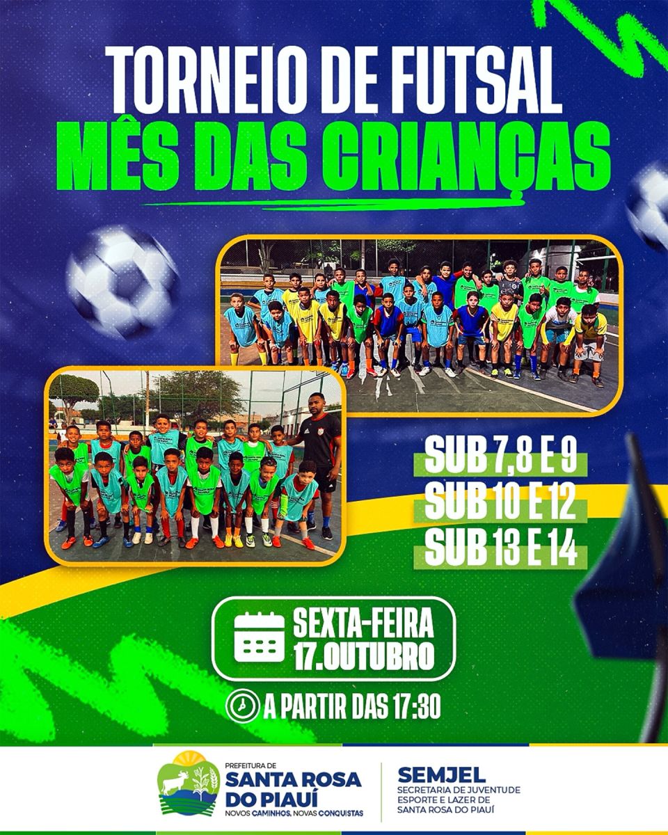 A Prefeitura de Santa Rosa do Piauí, por meio da Secretaria Municipal de Juventude, Esporte, Lazer e Cultura (SEMJEL), promove nesta sexta-feira, 17 de outubro, o Torneio Infantil em comemoração ao Mês das Crianças, na Quadra Poliesportiva, a partir das 17h30.